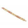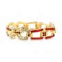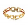 - Specs: 24 karat gold plated, equestrian link bracelet with double horseshoe-shaped links; round, clear crystal accents; straight bar links with red epoxy enamel and scroll background; round red crystals on connector links