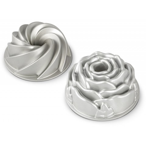 Create crisp, clean creative pattern designed cakes with Nordic Rose & Heritage Cakelet set. The swirling and rose design of this set makes a beautiful addition to any table or party. Made by Nordic Ware, the cast-aluminum pan is able to provide sharp detail on every cake you bake. With interior nonstick coating that makes it easy to release the cake and assures easy cleanup time after time. The cake could be served as-is or garnished with fresh berries or dusted with confectioners’ sugar – depending on what you like. Surprise your guests or family with simple yet classic cake designs!