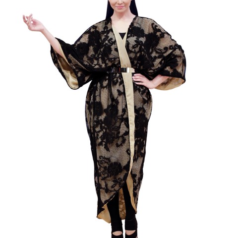 مهما تعددت الأزياء يبقى للرداء سحره الخاص لدى معظم النساء فهو يضفي سحراً وطابعاً خاصاً على الأنثى. لذلك نقدم لكل سيدة تحب التميز رداء فاشن من دار أزياء منى فارس. يتميز الرداء بتصميمه الفريد الذي يلفت الأنظار حيث يمكن ارتدائه كوشاح أو لفه مثل الكيمونو أو حتى إرتدائه مع الحزام للحصول على إطلالات متعددة ولتبرزي جمال أنوثتك الفاتنة. مصنوع من الشيفون باللون البيج ومزين بالدانتيل الأسود الراقي ليضفي عليك لمسة عصرية . الإختيار المثالي!