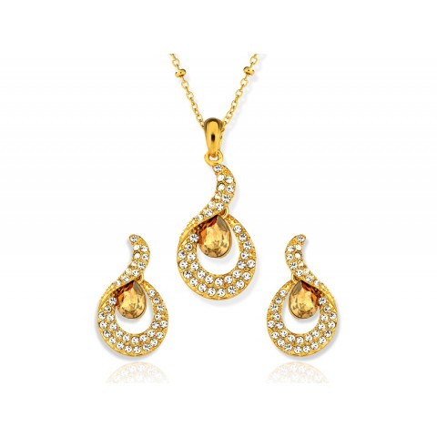 صمم طقم الدمعة الذهبي على شكل أجاصة متدلية مستوحاة من سراب الصحراء العربية ورمالها الذهبية ليلبي ذوق المرأة العربية. يتكون هذا الطقم الفريد من قلادة و زوج من الأقراط ورصعت بصفوف من قطع الكريستال الصغيرة المتلألئة لتكون كخيوط أشعة الشمس الذهبية البراقة.المواصفات: