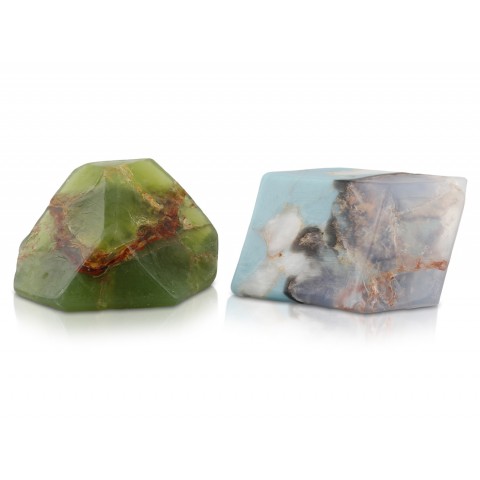 The beauty of gem stones is brought to your bathroom in the form of a beautiful handmade organic soap. It takes nearly 180 steps to make each Savons Gemme soap gem, so no two are the same, not even the weight which varies from a minimum 170 grams up to 200 grams. The extraordinary patterns go all the way through the soap so as you use them they wear down like pebbles in a stream, retaining their color and beauty. Each soap gem has its own delicate fragrance to relax you. The creamy lather of your soap gem will gently cleanse your skin and leave it soft. It’s great for shaving too! Top quality ingredients make Savons Gemme soap suitable for the most sensitive skin. They contain nature extracts like Aloe Vera, Chlorophyll, Chamomile, Calendula, Lavender, Olive Oil, and others.