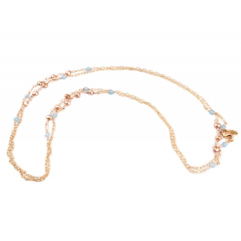 كوني متميزة و تألقي بهذا العقد الطويل الرائع من اللؤلؤ و أحجار اليشم من مجموعة ماري تشافيز ! صقل هذا العقد المميز من النحاس الأصفر المطلي بالذهب و ترصعه اللآلئ الوردية اللون و أحجار اليشم المطلية باللون الأزرق الفاتح و قد تزينت به النجمة الرائعة جوليا روبرتس. احصلي على الإطلالة الأنيقة ذاتها مع هذا العقد الرائع. تصميم مثالي لكل من تهوى التميز!