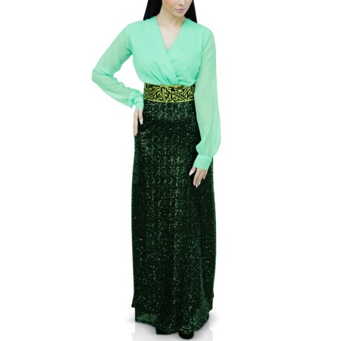 يجمع فستان غلا بين البساطة والأناقة. صنع من الشيفون الناعم بياقة سبعة حيث يمزج بين اللون الأخضر الصافي و وبقصة أنثوية تعيدك الى أيام السبعينات مع تنورة الترتر باللون الأسود الراقي البراق و مزين على الخصر بحزام ذهبي يبرز جمال انوثتك الفاتنة. اختيار مثالي لأجمل المناسبات!
